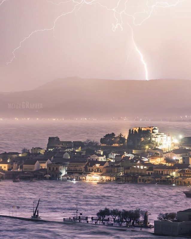 Στη παρακάτω φωτογραφία βλέπετε το Πυθαγόρειο την ώρα που ένας κεραυνός από το μέτωπο που πλησίαζε, φώτισε τη θάλασσα, αποκαλύπτοντας την ταραχή που επικρατούσε. Το πρωί δυστυχώς, βρήκε πολλές περιοχές του Πυθαγορείου και του γειτονικού Ηραίου, να μετρούν τις πληγές τους, καθώς τα κύματα μπήκαν ορμητικά μέσα στους οικισμούς.