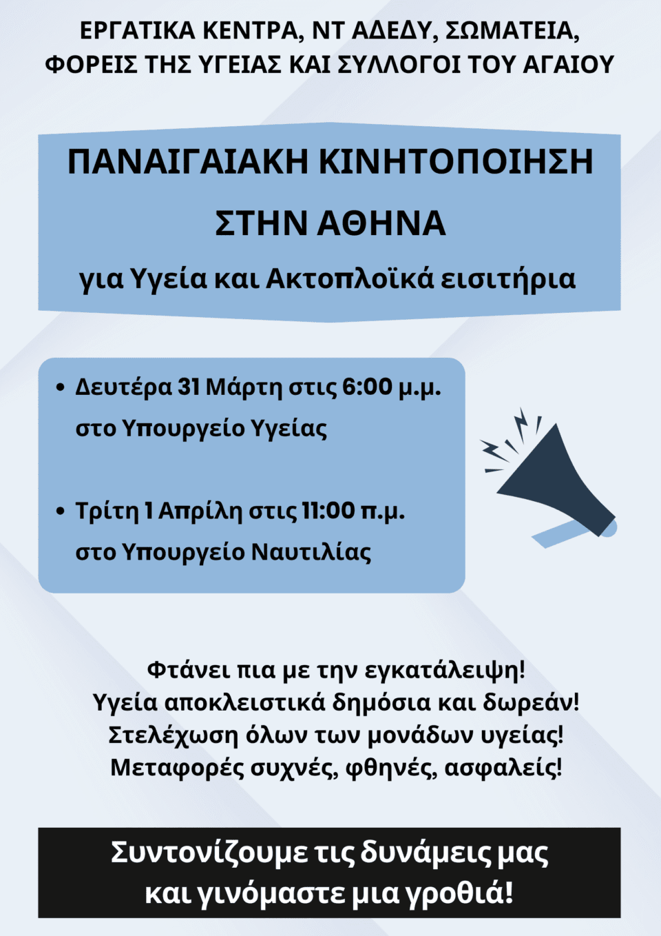 Με μαζικές κινητοποιήσεις απαντούν τα νησιά του Αιγαίου στην συνεχιζόμενη υποβάθμιση των υπηρεσιών υγείας και την εκτόξευση των ακτοπλοϊκών εισιτηρίων. Εργατικά Κέντρα, σωματεία και σύλλογοι, από τη Σάμο έως τη Λέσβο και την Κω, καλούν σε παναιγαικό ξεσηκωμό στην Αθήνα, με συγκεντρώσεις στο Υπουργείο Υγείας (31 Μαρτίου, 18:00) και το Υπουργείο Ναυτιλίας (1 Απριλίου, 11:00).
