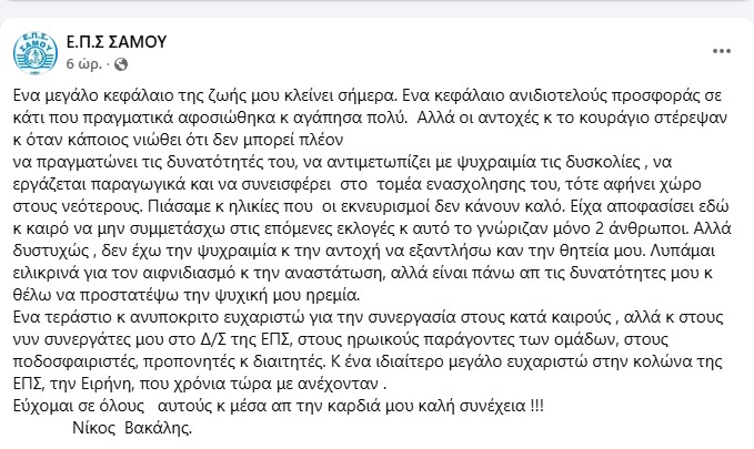 Με ανάρτηση στα μέσα κοινωνικής δικτύωσης ανακοίνωσε την παραίτησή του ο πρόεδρος της ΕΠΣ Σάμου, Νίκος Βακάλης, βάζοντας έτσι τέλος σε μια μακρά πορεία στον χώρο του ποδοσφαίρου του νησιού.