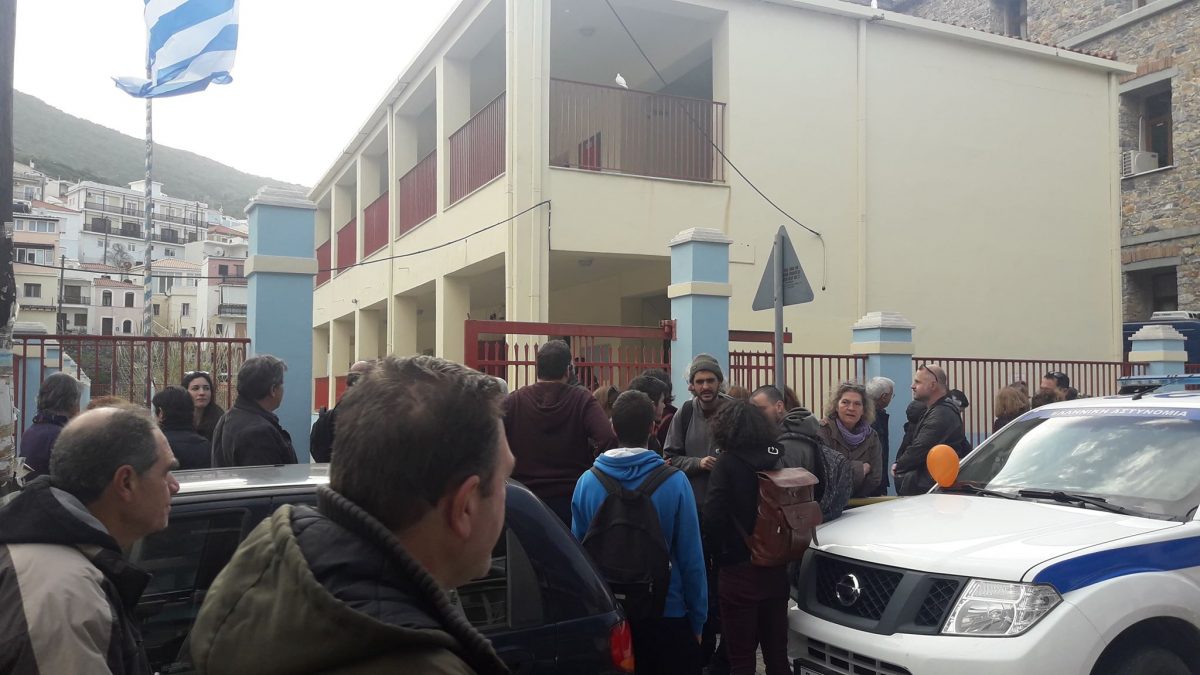 Συνοδευόμενα από τους γονείς τους, τα παιδιά έφτασαν στη σχολική μονάδα με τα πόδια αφού κηρύχθηκε άγονος ο διαγωνισμος της Περιφέρειας Βορείου Αιγαίου για την μεταφορά τους , όπου εκεί εκπαιδευτικοί και άλλοι φορείς –  εκ’ των οποίων ορισμένοι  κρατούσαν χαρτιά με τη λέξη “Καλωσορίσατε” γραμμένο στα φαρσί και τα αραβικά- τους  υποδέχτηκαν με χειροκροτήματα.