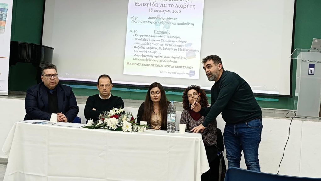 Η πρόληψη και η σύγχρονη αντιμετώπιση του σακχαρώδη διαβήτη βρέθηκαν στο επίκεντρο εσπερίδας που πραγματοποιήθηκε την Τετάρτη 28 Ιανουαρίου στη Δυτική Σάμο. Γιατροί διαφορετικών ειδικοτήτων παρουσίασαν τα νεότερα επιστημονικά δεδομένα, απαντώντας σε ερωτήματα που αφορούν άμεσα την καθημερινότητα των πολιτών.