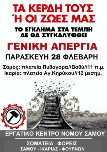 Δύο χρόνια μετά την τραγωδία στα Τέμπη, το Εργατικό Κέντρο Νομού Σάμου, σε συνεργασία με σωματεία και φορείς, καλεί σε μαζική συμμετοχή στην πανελλαδική απεργία της 28ης Φεβρουαρίου. Με το σύνθημα «Τα κέρδη τους ή οι ζωές μας – Το έγκλημα στην Τέμπη δε θα συγκαλυφθεί», οι κάτοικοι της Σάμου και της Ικαρίας ενώνουν τις φωνές τους με τους υπόλοιπους εργαζόμενους της χώρας, διεκδικώντας δικαιοσύνη και λογοδοσία για την εθνική τραγωδία.