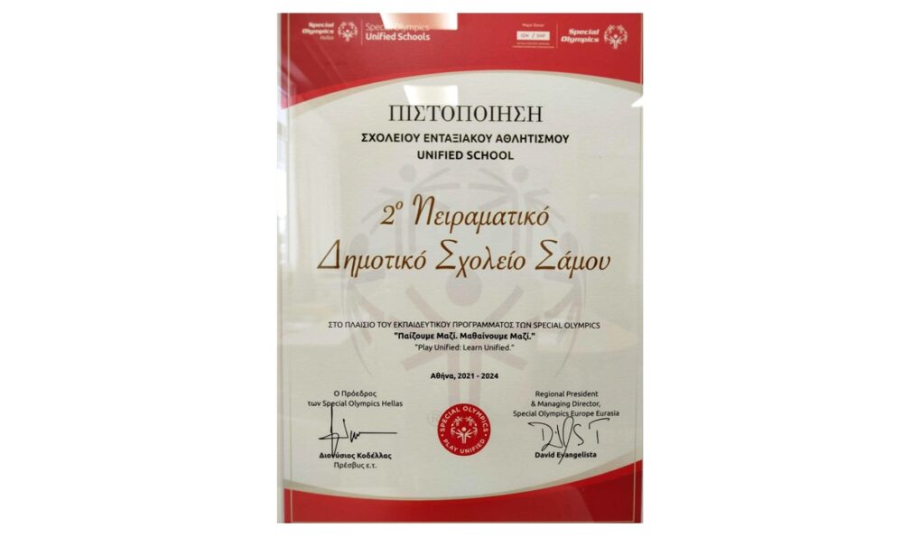 Το 2ο Πειραματικό Δημοτικό Σχολείο Σάμου έλαβε πιστοποιητικό από τα Special Olympics Hellas, αποκτώντας τον τίτλο «Σχολείο Ενταξιακού Αθλητισμού (Unified School)». Η διάκριση αφορά την υλοποίηση δράσεων που ενισχύουν την ένταξη μέσω του αθλητισμού, σε συνεργασία με το Ειδικό Δημοτικό Σχολείο Σάμου, κατά τη διάρκεια του σχολικού έτους 2024-2025.