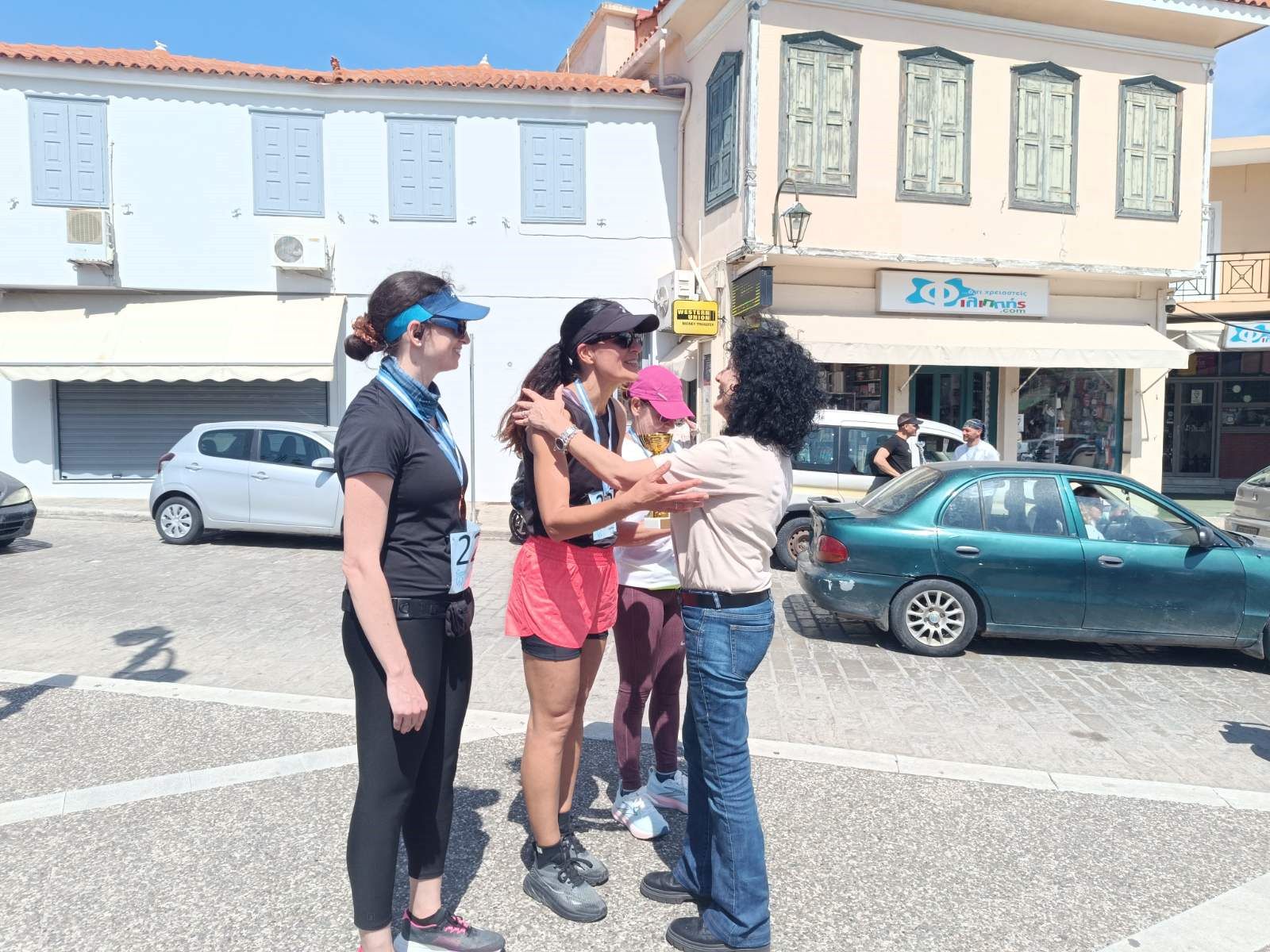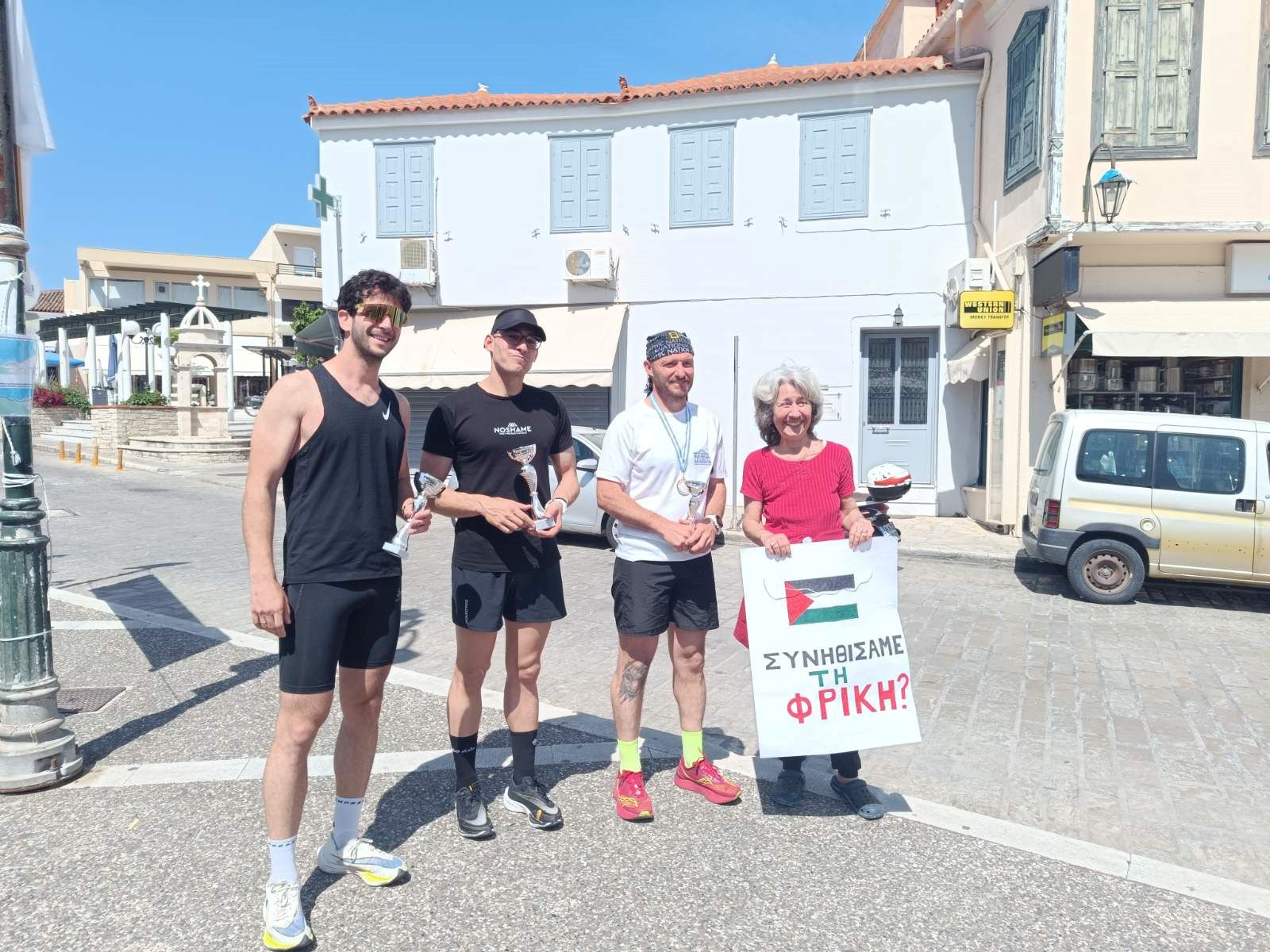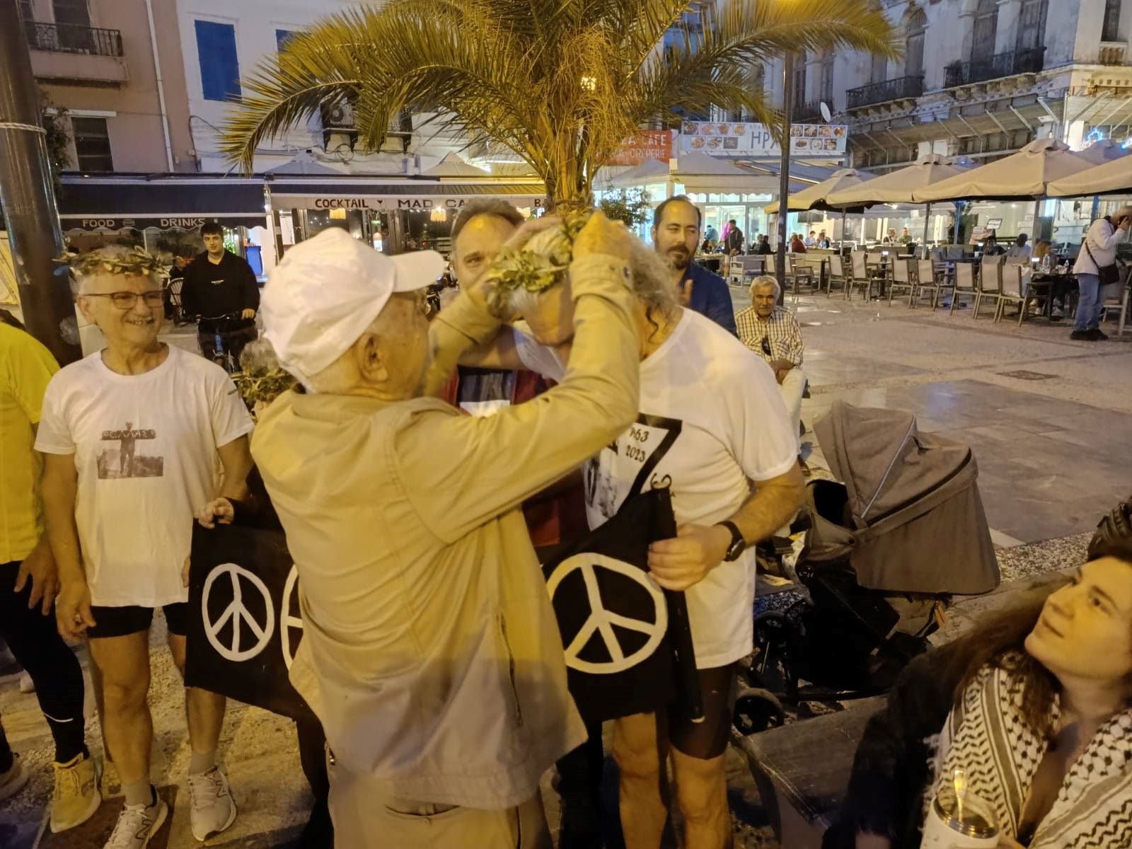 Αμέσως μετά, ιδιαίτερα συγκινητική ήταν η στιγμή του τερματισμού των  ειρηνοδρόμων Θανάση Κονταξή, Δημήτρη Καραγεωργίου, Νίκης Καραγεωργίου, Σάκη Νιώτη και Διόνυσου Νιώτη που έτρεξαν στη διαδρομή Πυθαγόρειο – Βαθύ και οι οποίοι βραβεύτηκαν με στεφάνια ελιάς που επιμελήθηκε η πρόεδρος του παραρτήματος της ΠΕΑΕΑ Κούλα Καραμηνά  – Πόθου.