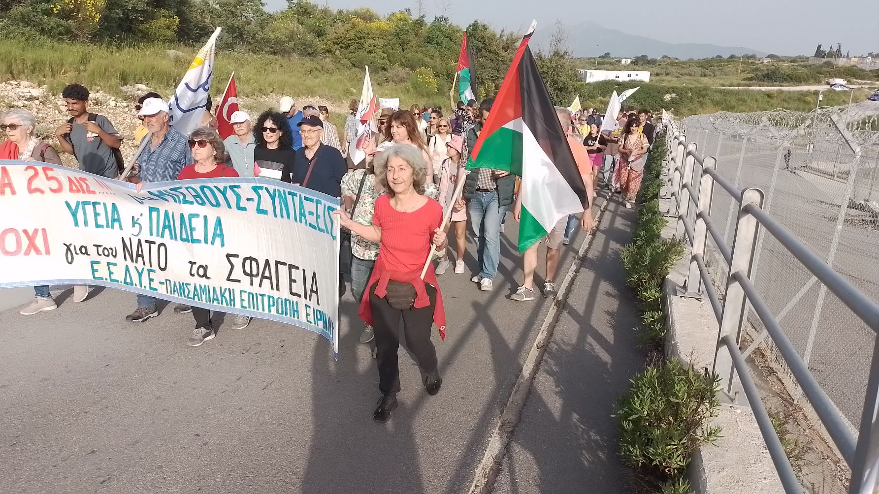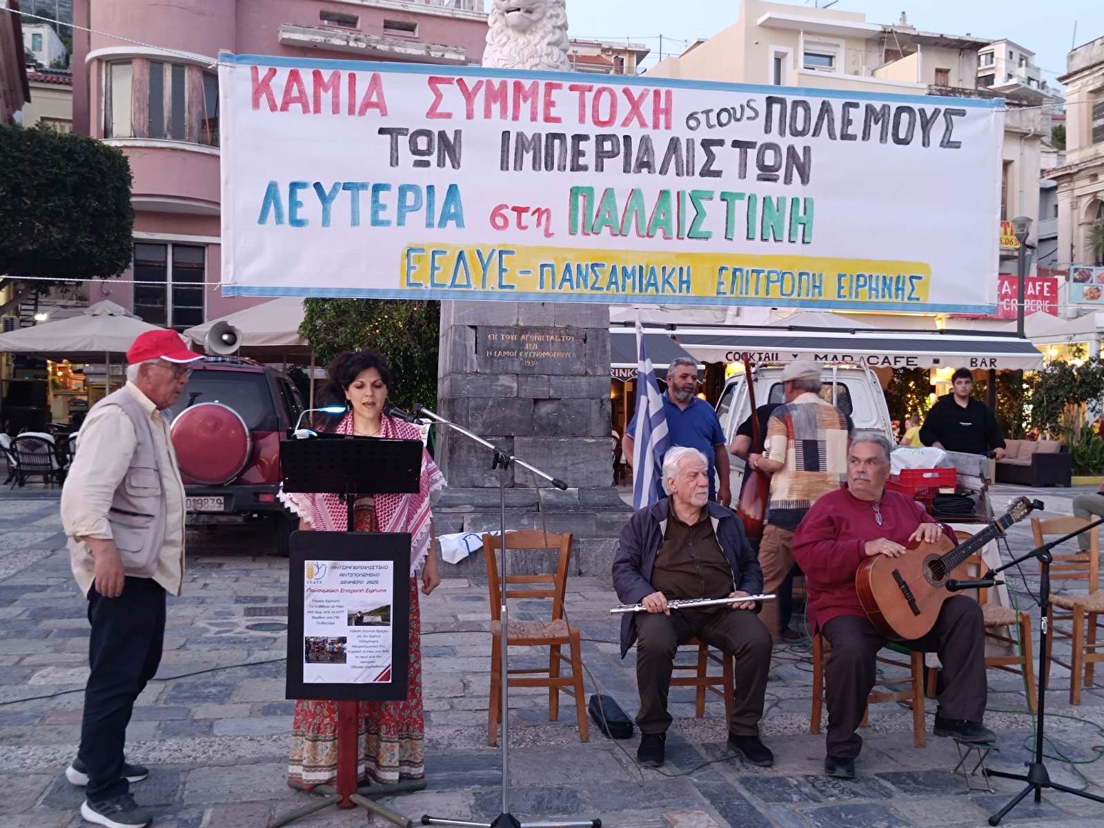 Ακολούθησε ομιλία από την πρόεδρο της Π.Ε.Ε Ρούλα Στεφανάκη μέλος του Εθνικού Συμβουλίου της ΕΕΔΥΕ , η οποία αναφέρθηκε στα πολεμοκάπηλα σχέδια του ΝΑΤΟ και της Ε.Ε με τους τεράστιους πόρους προς τη λεγόμενη  «πολεμική οικονομία» ενώ υπογράμμισε τις ευθύνες της ελληνικής κυβέρνησης ως πρωτοπαλίκαρου του ιμπεριαλισμού  στη περιοχή που κόβει δαπάνες από τις ανάγκες του λαού για να δώσει ακόμη 25 δις για ΝΑΤΟϊκούς εξοπλισμούς. Κατάγγειλε τα παζάρια για το Αιγαίο, την Κύπρο και την Ανατολική Μεσόγειο και τους κινδύνους που αυτά εγκυμονούν για την ειρήνη στη περιοχή. Εξέφρασε ακόμη μια φορά την αλληλεγγύη του ελληνικού λαού στη Παλαιστίνη και καταδίκασε την συμμαχία της Ελλάδας με το κράτος – δολοφόνο του Ισραήλ.