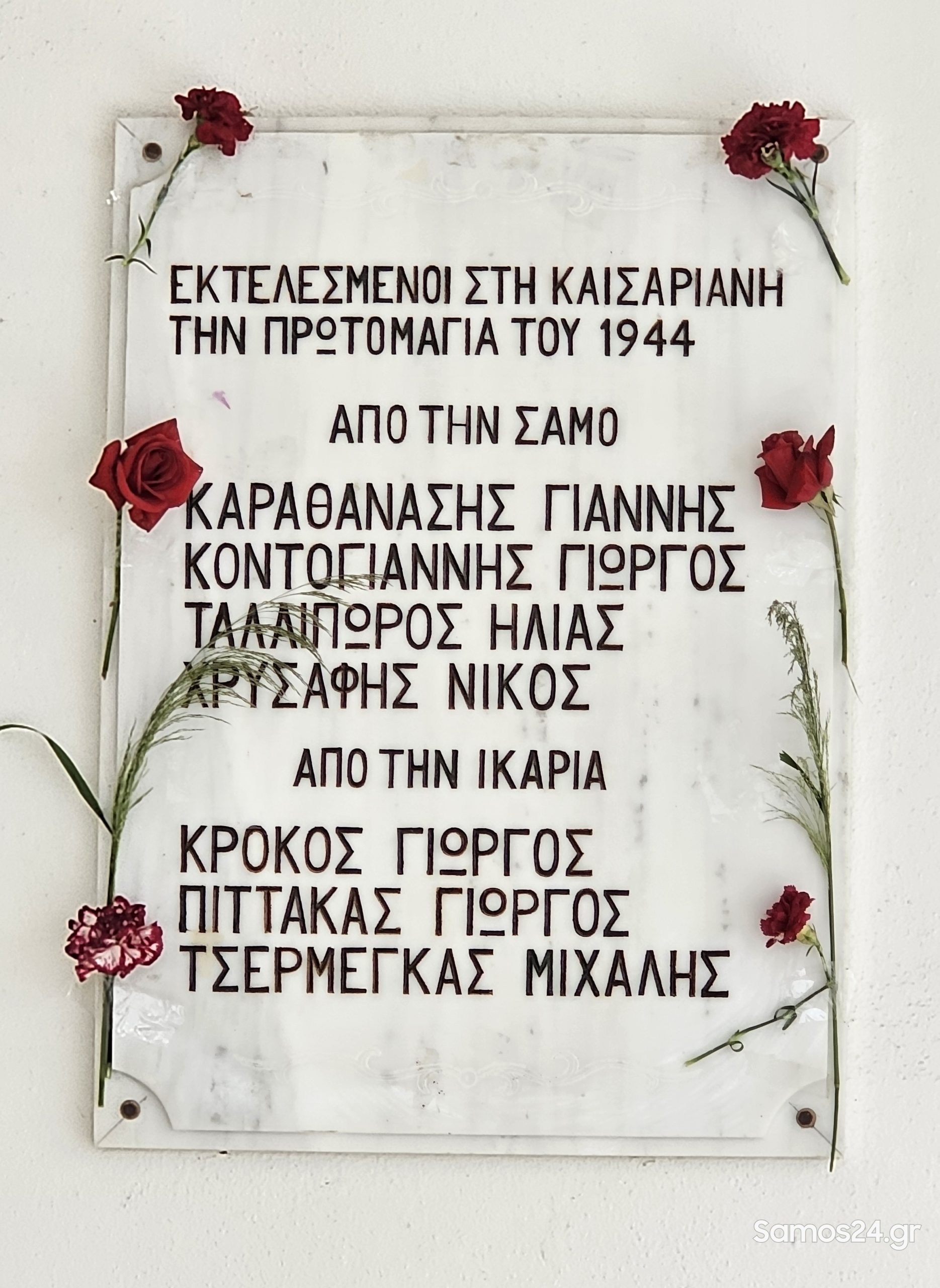 Οι εκδηλώσεις στη Σάμο ξεκίνησαν από τον προαύλιο χώρο του ΕΚΣ, όπου έγινε κατάθεση στεφάνων στην τιμητική πλάκα για τους εκτελεσθέντες Σαμιώτες και Ικαριώτες στο Σκοπευτήριο της Καισαριανής την 1η Μαΐου 1944. Στεφάνια κατέθεσαν εκπρόσωποι του ΕΚΣ, του Νομαρχιακού Τμήματος (ΝΤ) Σάμου της ΑΔΕΔΥ, της Επιτροπής Ειρήνης Σάμου, της Προοδευτικής Κίνησης Γυναικών Σάμου και του Παραρτήματος Σάμου της Πανελλήνιας Ένωσης Αγωνιστών Εθνικής Αντίστασης (ΠΕΑΕΑ).