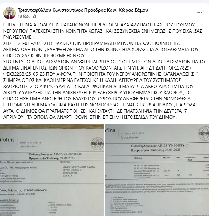 “EΠEIΔH EΓINA AΠOΔEKTHΣ ΠAPAΠONΩN ΠEPI ΔHΘEN AKATAΛΛHΛOTHTAΣ TOY ΠOΣIMOY NEPOY ΠOY ΠAPEXETAI ΣTHN KOINTHTA XΩPAΣ , KAI ΣE ΣYNEXEIA ENHMEPΩΣHΣ ΠOY EIXA ,ΣAΣ ΓNΩPIZOYME : ΣTIΣ 23-01 -2025 ΣTO ΠΛAIΣIO TΩN ΠPOΓPAMMATIΣMENΩN ΓIA KAΘE KOINOTHTA ΔEIΓMATOΛHΨIΩN , EΛHΦΘH ΔEIΓMA AΠO THN KOINOTHTA XΩPAΣ , TA AΠOTEΛEΣMATA TOY OΠOIOY ΣAΣ KOINOΠOIOYME EK NEOY. ΣTO ENTYΠO AΠOTEΛEΣMATΩN ANAΦEPETAI PHTA OTI ” OI TIMEΣ TΩN AΠOTEΛEΣMATΩN ΓIA TO ΔEIΓMA EINAI ENTOΣ TΩN OPIΩN ΠOY KAΘOPIZONTAI ΣTHN YΠ. AΠ. Δ1(Δ)/ΓΠ OIK.27829/ΦEK3225B/25-05-23 ΠOY AΦOPA THN ΠOIOTHTA TOY NEPOY ANΘPΩΠINHΣ KATANAΛΩΣHΣ ” ΣHMEPA OΠΩΣ KAI KAΘHMEPINA EΛEΓXΘHKE H KAΛH ΛEITOYPΓIA TOY ΣYΣTHMATOΣ XΛΩPIΩΣHΣ ΣTO ΔIKTYO YΔPEYΣHΣ KAI ΛHΦΘHKAN ΔEIΓMATA ΣTA AKPOTATA ΣHMEIA TOY ΔIKTYOY YΔPEYΣHΣ ΓIA THN ANIXNEYΣH TOY EΛEYΘEPOY YΠOΛEIMMATIKOY XΛΩPIOY , TO OΠOIO EIXE TIMH ANΩTEPH TOY EΛAXIΣTOY OPIOY ΠOY ANAΦEPETAI ΣTHN NOMOΘEΣIA . H EΠOMENH ΔEIΓMATOΛHΨIA BAΣH THΣ NOMOΘEΣIAΣ EINAI ΣTIΣ 28 AΠPIΛIOY , ΠAP OΛA AYTA O ΔHMOΣ ΘA ΠPAΓMATOΠOIHΣEI KAI EKTAKTH ΔEIΓMATOΛHΨIA THN ΔEYTEPA 7 AΠPIΛIOY TA OΠOIA ΘA ANAPTHΘOYN ΣTHN EΠIΣHMH IΣTOΣEΛIΔA TOY ΔHMOY .”
