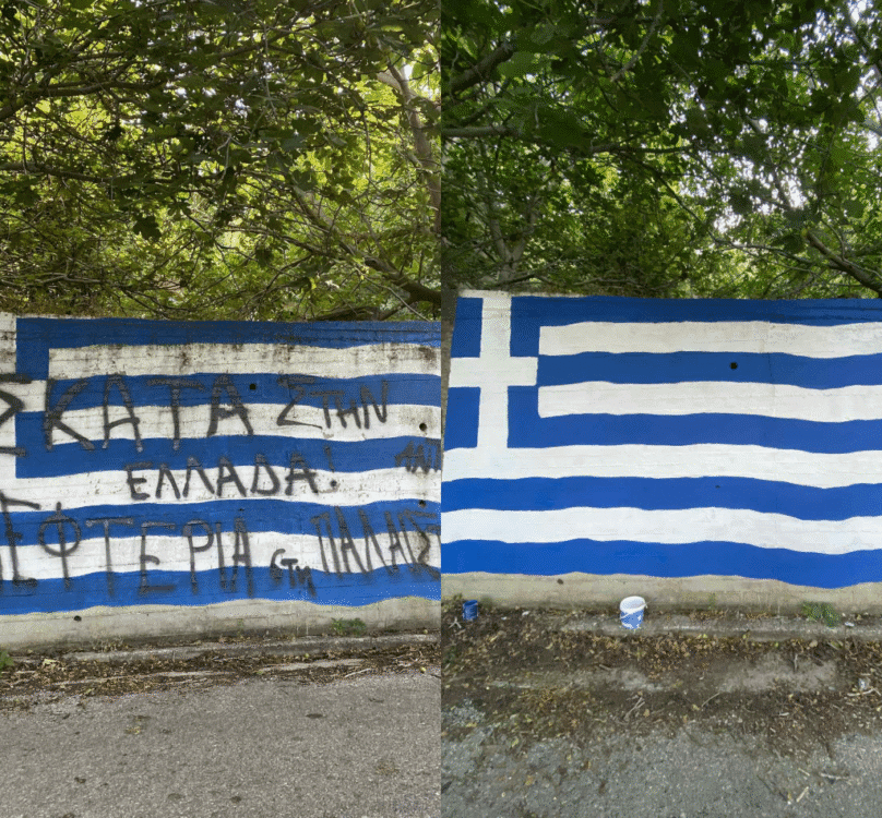 Το Σωματείο Εθελοντών Πολιτικής Προστασίας (ΣΕΠΠ) Κοσμαδαίων ανέλαβε για ακόμη μια φορά την αποκατάσταση της ζωγραφισμένης ελληνικής σημαίας που κοσμεί ένα τοιχίο στην είσοδο του χωριού, μετά από βανδαλισμό με συνθήματα.