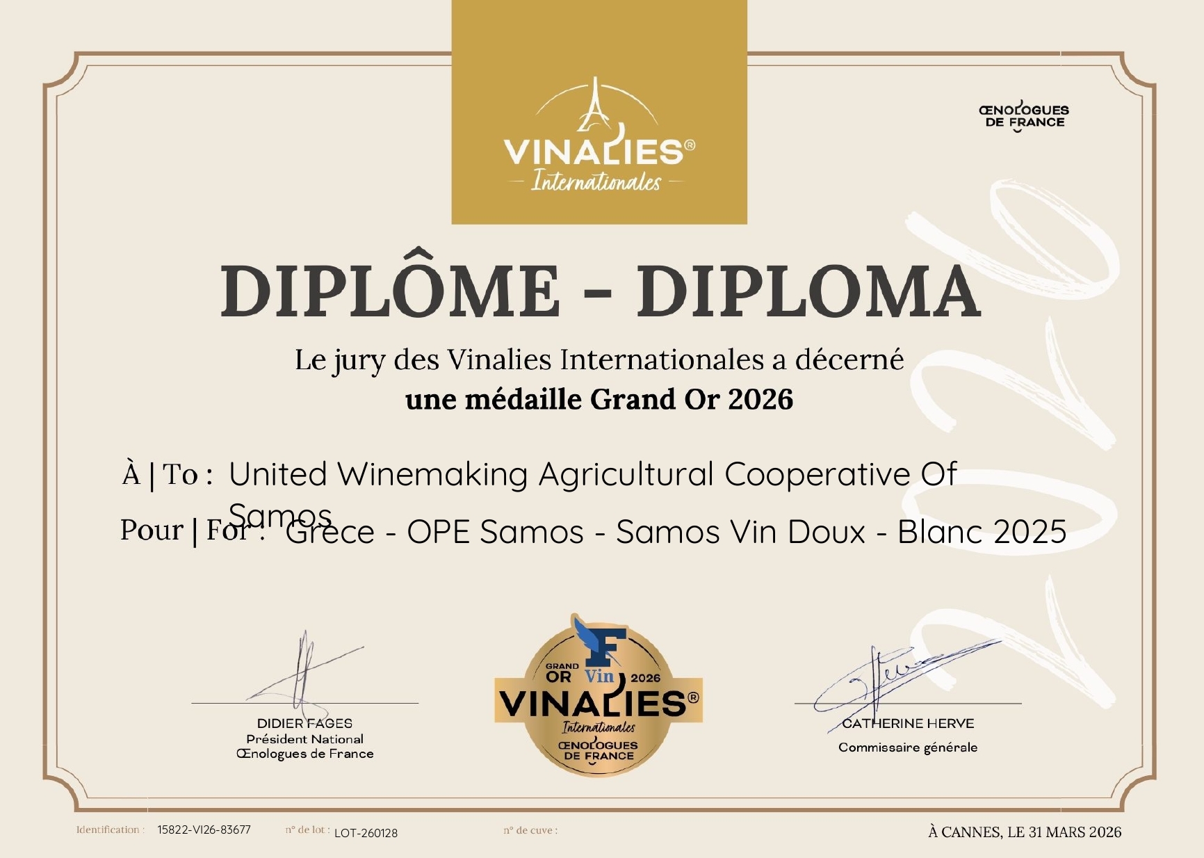 Samos Vin Doux 2025 – ΜΕΓΑΛΟ ΧΡΥΣΟ (Grand Or): Ο «βασιλιάς» των γλυκών κρασιών κατέκτησε την ανώτατη δυνατή διάκριση. Με το λαμπερό του χρυσαφένιο χρώμα και τα μελωμένα αρώματα βερίκοκου, μαρμελάδας και καραμέλας, απέδειξε γιατί θεωρείται σε όλον τον κόσμο ένα διαχρονικό οινικό αριστούργημα.