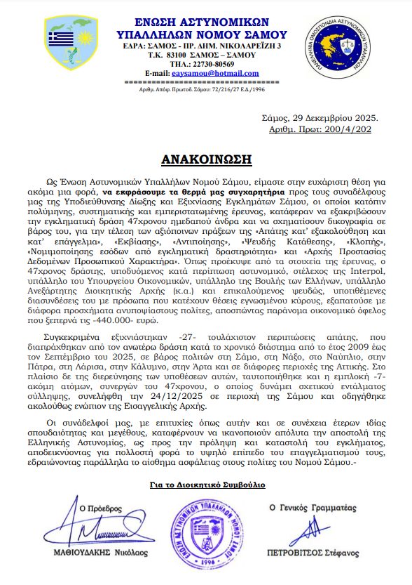 Εξιχνιάστηκαν, μετά από συστηματική και εμπεριστατωμένη έρευνα, 27 τουλάχιστον περιπτώσεις απάτης, που διαπράχθηκαν το διάστημα 2009 έως Σεπτέμβριο 2025, σε βάρος πολιτών, στη Σάμο, στη Νάξο, στο Ναύπλιο, στην Πάτρα, στη Λάρισα, στην Κάλυμνο, στην Άρτα και σε διάφορες περιοχές της Αττικής.