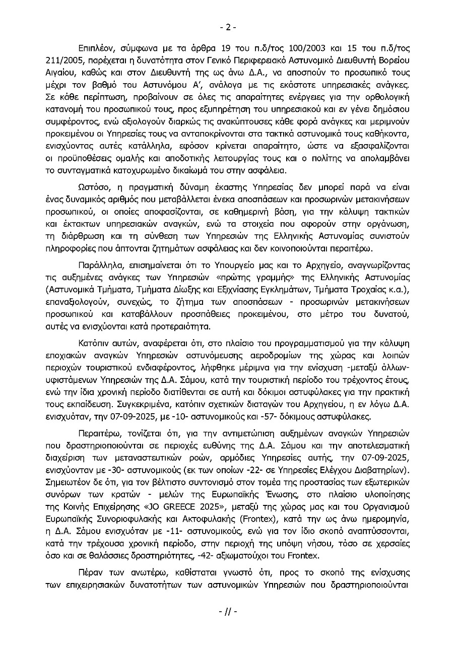 2. Ποιος θα είναι ο ακριβής αριθμός των θέσεων κατά τις επερχόμενες συμπληρωματικές μεταθέσεις για την ενίσχυση της Αστυνομικής Διεύθυνσης Σάμου.