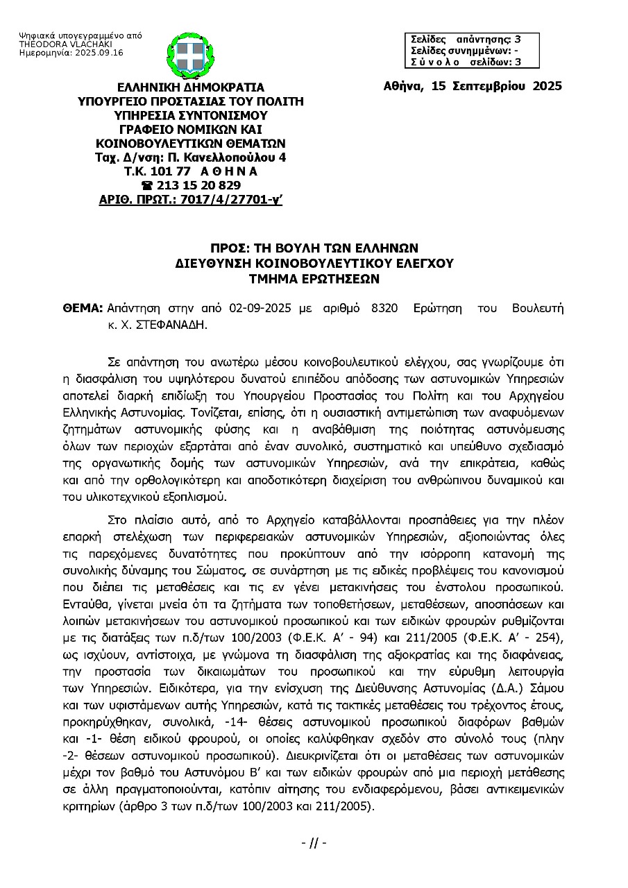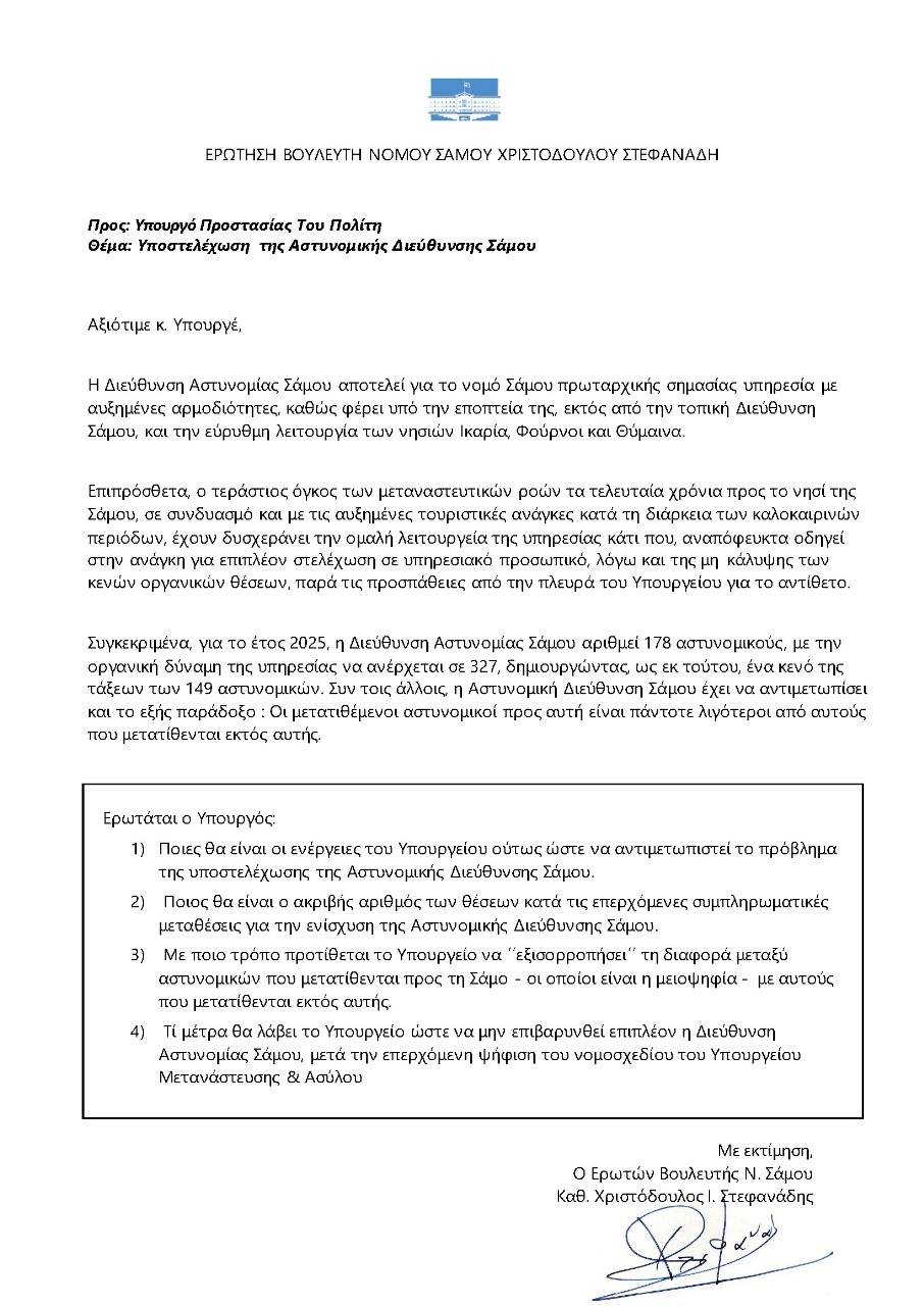Το χρόνιο πρόβλημα της υποστελέχωσης της Αστυνομικής Διεύθυνσης Σάμου έφερε στη Βουλή ο βουλευτής του νομού, Χριστόδουλος Στεφανάδης, με ερώτηση προς το Υπουργείο Προστασίας του Πολίτη. Ο κ. Στεφανάδης τόνισε ότι η υπηρεσία λειτουργεί με το μισό προσωπικό από το προβλεπόμενο, γεγονός που επηρεάζει άμεσα την ασφάλεια των πολιτών και τη φύλαξη των συνόρων. Στη συνέχεια παρατίθενται αυτούσιες η ερώτηση του βουλευτή και η απάντηση του Υπουργείου.