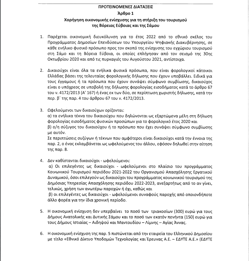 Οικονομικό μπόνους 300 ευρώ για όσους επιλέξουν την Σάμο για διακοπές και 150 ευρώ για τους δήμους Ιστιαίας – Αιδηψού και Μαντουδίου – Λίμνης – Αγίας Αννας προβλέπει κυβερνητική τροπολογία που κατατέθηκε στην Βουλή.