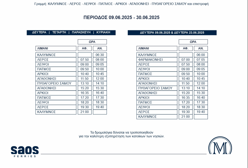 Η SAOS FERRIES ανακοίνωσε τα θερινά της δρομολόγια για την περίοδο 09.06.2025 – 30.06.2025, συνδέοντας την Κάλυμνο με τη Λέρο, την Πάτμο, τους Αρκιούς, τους Λειψούς, τους Αγαθονήσι και το Πυθαγόρειο της Σάμου.