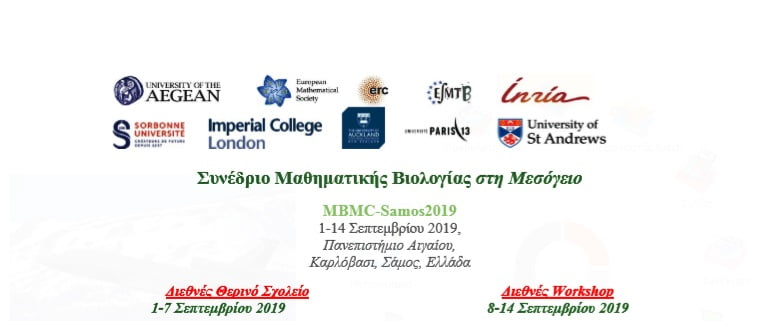 Το συνέδριο Μαθηματικής Βιολογίας MBMC-Samos2019, θα λάβει χώρα στο Πανεπιστήμιο Αιγαίου στη Σάμο και θα αποτελείται από δύο διακριτές διαδοχικές δράσεις αφιερωμένες σε διάφορα θέματα Μαθηματικής Βιολογίας. Πρώτη εβδομάδα: Θερινό Σχολείο, 01-07 Σεπτεμβρίου. Δεύτερη εβδομάδα: Workshop, 08-14 Σεπτεμβρίου.