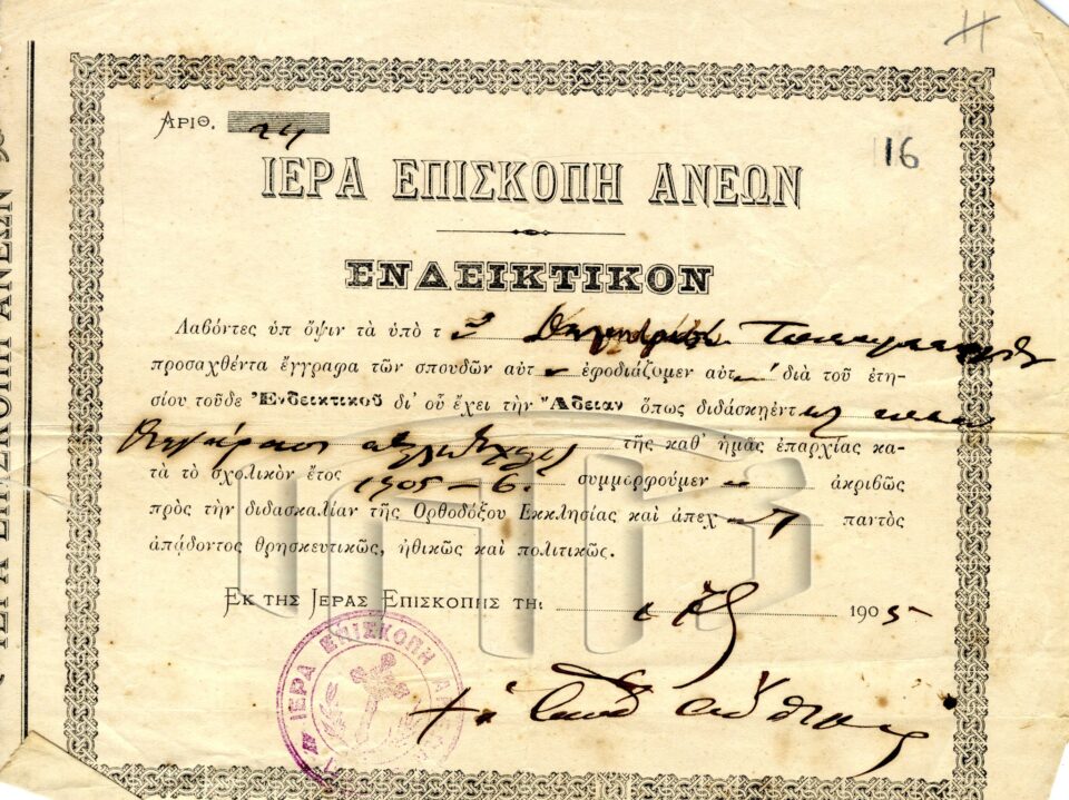 Άδεια διδασκαλίας εκδοθείσα από την Ιερά Μητρόπολη Ανέων για το σχολικό έτος 1905–1906.