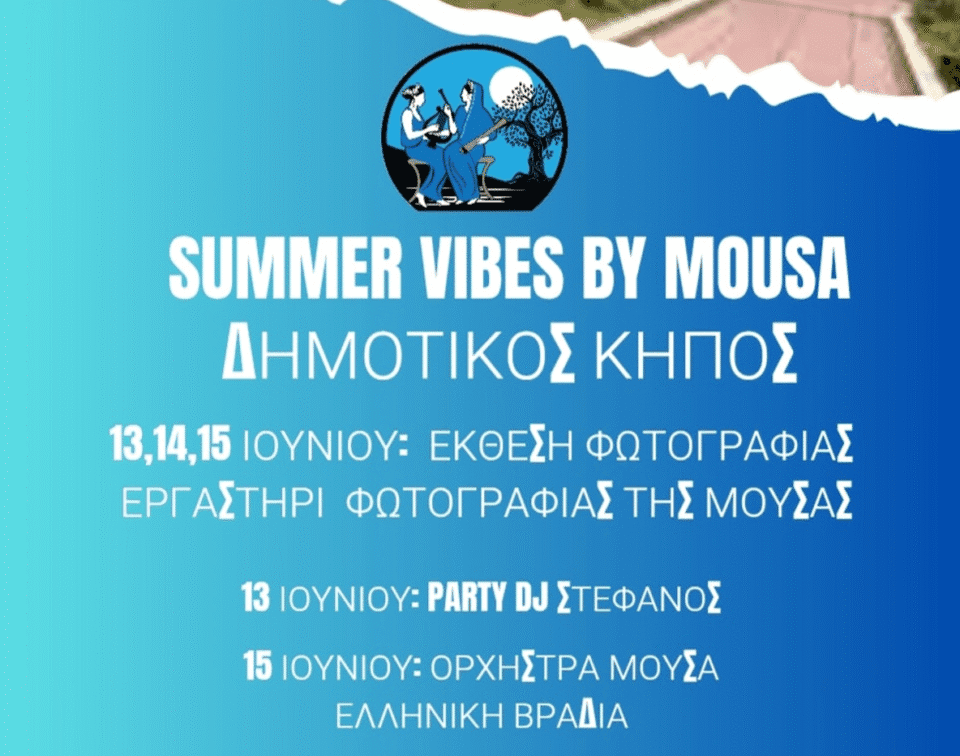 Ο Πολιτιστικός και Επιμορφωτικός Σύλλογος Σάμου «Η ΜΟΥΣΑ ΤΩΝ ΣΑΜΙΩΝ» σας προσκαλεί στο “Summer Vibes by MOUSA“, ένα τριήμερο αφιερωμένο στην φωτογραφία, τη μουσική και την καλοκαιρινή διάθεση, που θα πραγματοποιηθεί στον Δημοτικό Κήπο Σάμου από 13 έως 15 Ιουνίου 2025.
