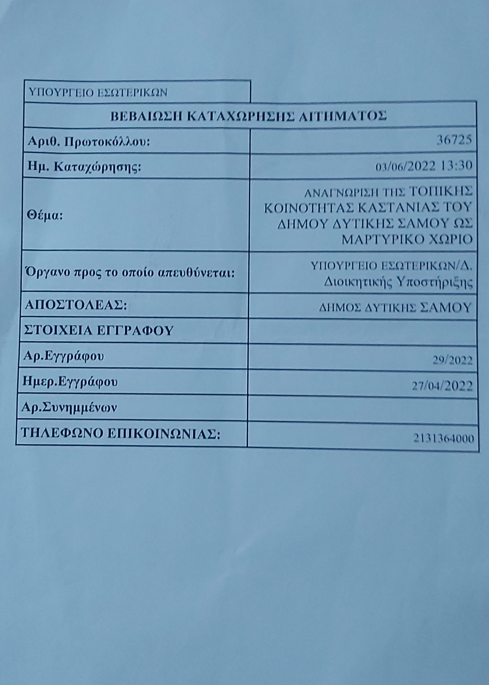 Στην περίπτωση του φράγματος Καρβούνη έλαβε προσφάτως την δέουσα απάντηση. Για τη δε περίπτωση της κοινότητας Καστανιάς και τον χαρακτηρισμό της ως μαρτυρικό χωριό, προς ενημέρωσή του, του παραθέτουμε τα ανάλογα στοιχεία για να γνωρίζει επιτέλους πότε και επί ποιάς Δημοτικής Αρχής ξεκίνησε η όλη διαδικασία. Πρώτον, υπήρξε ΟΜΟΦΩΝΗ απόφαση του Δημοτικού Συμβουλίου του Δήμου Δυτικής Σάμου (αρ. 22/2022 – 27 Απριλίου 2022) με θέμα: «Αναγνώριση της Τοπικής Κοινότητας Καστανιάς του Δήμου Δυτικής Σάμου ως Μαρτυρικό χωριό». Δεύτερον, η κατάθεση φακέλου προς το Υπουργείο Εσωτερικών ολοκληρώθηκε 3 Ιουνίου του 2022 (αρ. πρ. 36725) που είχε ως αποτέλεσμα την έκδοση απόφασης στις 3 Αυγούστου 2022 από το Υπουργείο για την συγκρότηση Επιτροπής, τα αποτελέσματα των εργασιών της οποίας προσφάτως δημοσιεύθηκαν στο Φ.Ε.Κ. 146/8-8-2025 Α΄.