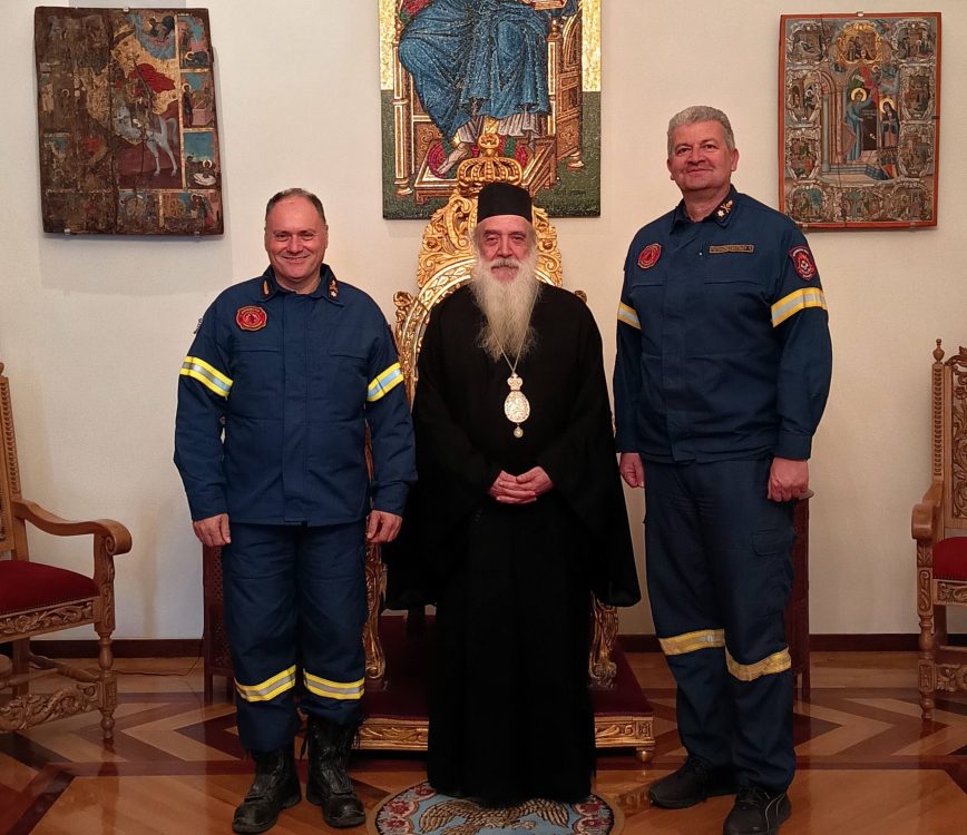 Κατά τη διάρκεια της συνάντησης, ο Σεβασμιώτατος καλωσόρισε τους δύο αξιωματικούς και τους ευχήθηκε καλή επιτυχία στο έργο τους. Ακολούθησε συζήτηση για ζητήματα που αφορούν την πρόληψη των πυρκαγιών, την προστασία εκκλησιαστικών χώρων και ευρύτερα θέματα κοινού ενδιαφέροντος.