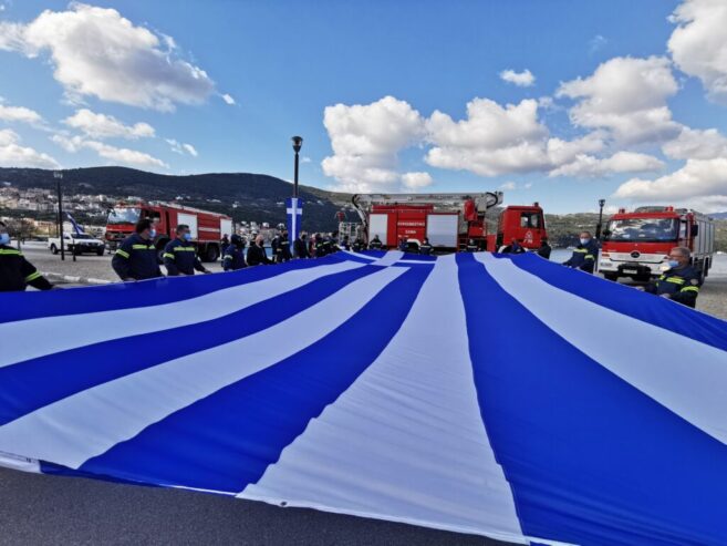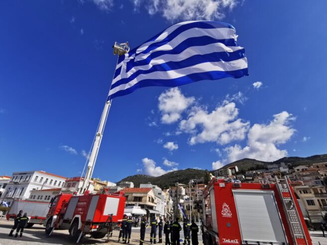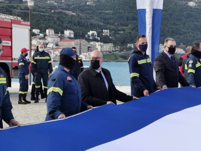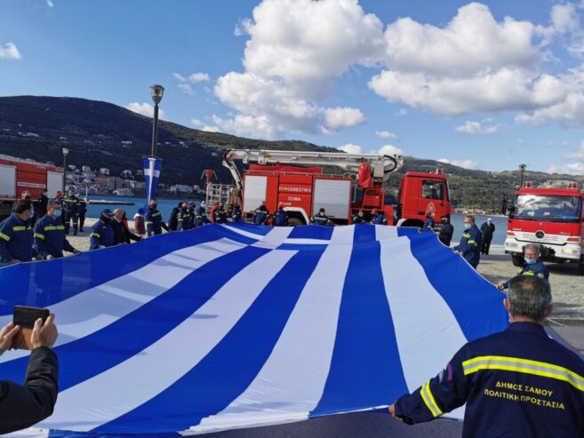 Μια γιγαντιαία σημαία υψώθηκε σήμερα, ανήμερα της 25ης Μαρτίου στη Σάμο, για την επέτειο των 200 χρόνων από την Επανάσταση του 1821.