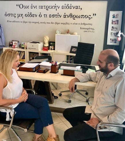 Είχε προηγηθεί συνάντηση μεταξύ της υποψήφιας βουλευτή Νομού Σάμου με τη Νέα Δημοκρατία, Ιωάννας Καραγιάννη και του Μάνου Λογοθέτη στο γραφείο του.