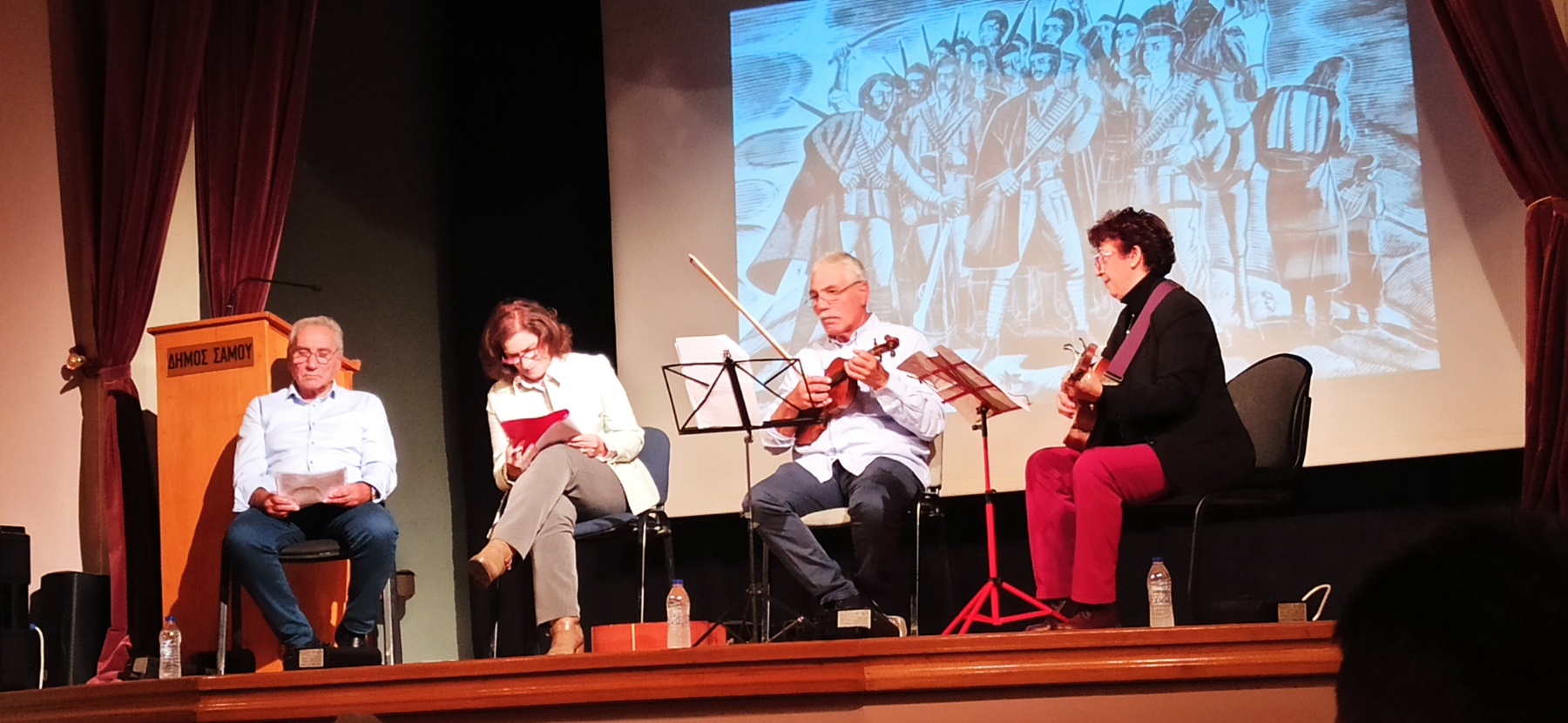 Στην εκδήλωση που έγινε την Τετάρτη 22-11-2023 στην αίθουσα του δήμου Ανατολικής Σάμου χαιρετισμό απηύθυνε η πρόεδρος του παραρτήματος ΠΕΑΕΑ-ΔΣΕ Κούλα Καραμηνά – Πόθου μιλώντας με στίχους κορυφαίων ποιητών που τα ποιήματά τους έχουν μελοποιηθεί και τραγουδιούνται όπως είπε σε όλες τις λαϊκές αγωνιστικές εκδηλώσεις.