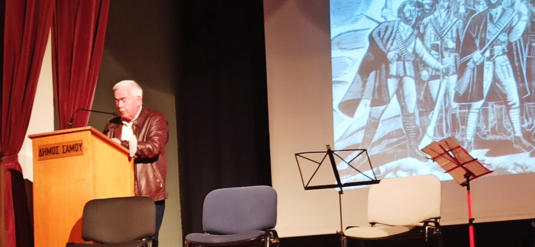 Ομιλητής στην εκδήλωση ήταν ο Κώστας Τζίχας μέλος της Τ.Ε Σάμου του ΚΚΕ και αντιπρόεδρος του παραρτήματος ΠΕΑΕΑ-ΔΣΕ, ο οποίος αναφέρθηκε αναλυτικά στο χρονικό της ΕΑΜικής Εθνικής Αντίστασης στη Σάμο και στα γεγονότα εκείνης της περιόδου υπογραμμίζοντας ότι «Το ΕΑΜ με τον αξιόμαχο λαϊκό του στρατό, τον ΕΛΑΣ (1350 άνδρες), απελευθέρωσε το νησί αξιοποιώντας τους δεσμούς που είχε αναπτύξει με τους αντιφασίστες – κομμουνιστές φαντάρους και αξιωματικούς της Ιταλικής Μεραρχίας «Κούνεο» που ήταν ο κατοχικός στρατός, απομονώνοντας από κοινού του φασίστες μελανοχίτωνες που είχαν αιματοκυλίσει τη Δυτική Σάμο μόλις 20 μέρες πριν. Πήρε μέτρα για τον επισιτισμό του λαού, αντικατέστησε τις κατοχικές κοινοτικές αρχές, απελευθέρωσε όλους τους κρατούμενους και ομήρους των κατοχικών αρχών, επέβαλλε την συμμετοχή του στην προσωρινή κυβερνητική επιτροπή υπό τον Μητροπολίτη Ειρηναίο και ήταν ο εγγυητής της ομαλής ζωής στις πόλεις και τα χωριά. Και όλα αυτά κόντρα στη διαταγή των Άγγλων που είχαν έρθει, 4 μέρες μετά την συνθηκολόγηση της Ιταλίας, ως επικυρίαρχοι και είχαν απαιτήσει “κανένας αντάρτης να μην κατέβει από τα βουνά και οι φυλακισμένοι και οι όμηροι να μείνουν στις φυλακές υπό την φρούρηση των Ιταλών”». « Ο “Ιερός Λόχος” –συμπλήρωσε ο ομιλητής– ήρθε 2 μήνες μετά την απελευθέρωση ως αντίβαρο του ΕΑΜ και μαζί με τους Άγγλους και την κυβέρνηση του Καϊρου χρησιμοποίησαν τη Σάμο ως πείραμα των σχεδιασμών τους για τις μεταπολεμικές εξελίξεις».