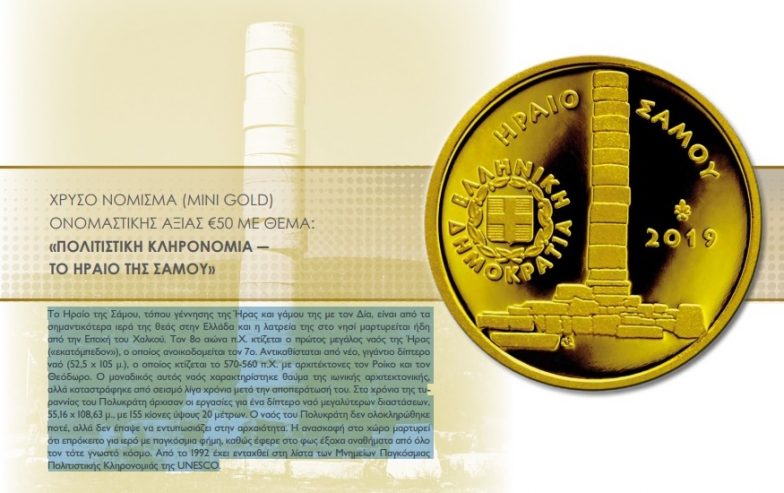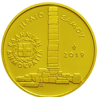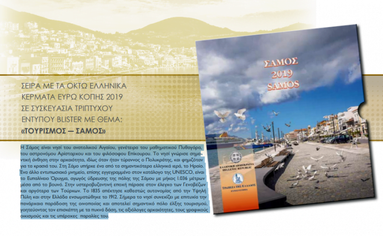 Αναμένεται να κυκλοφορήσει από την Τράπεζα της Ελλάδος και να δοθεί στη διάθεση του κοινού ένα χρυσό συλλεκτικό νόμισμα, αφιερωμένο στο Ηραίον της Σάμου, καθώς και μιας σειράς με τα οκτώ ελληνικά κέρματα ευρώ κοπής 2019, σε συσκευασία τρίπτυχου εντύπου Blister, με θέμα «Τουρισμός-Σάμος».