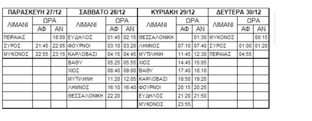 Η τροποποίηση αφορά τις ημερομηνίες από σήμερα Παρασκευή 27 Δεκεμβρίου 2024 έως και τη Δευτέρα 30 Δεκεμβρίου 2024 (συμπεριλαμβανομένης της άφιξης στον Πειραιά). Οι νέες ώρες αναχώρησης και άφιξης έχουν εγκριθεί και παρουσιάζονται στον αναθεωρημένο πίνακα δρομολογίων.