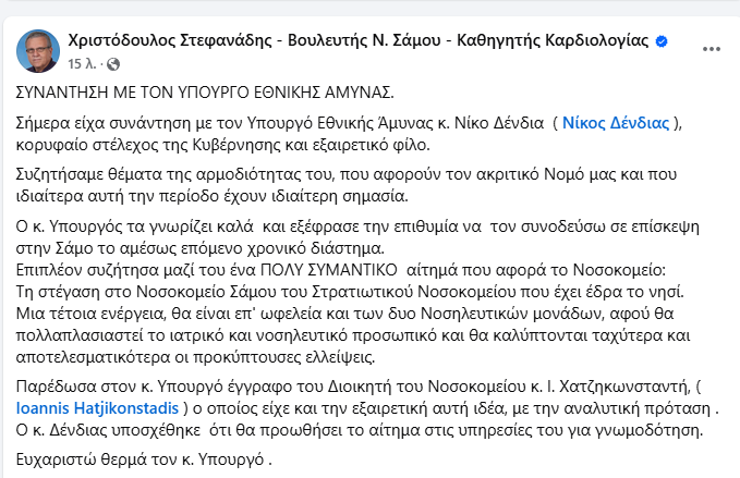 «Ευχαριστώ θερμά τον κ. Υπουργό για την εποικοδομητική συζήτηση και την ανταπόκριση στα αιτήματα μας. Η συστέγαση των δύο νοσοκομείων θα αποτελέσει ένα σημαντικό βήμα για την ενίσχυση της δημόσιας υγείας στη Σάμο», δήλωσε ο κ. Στεφανάδης μετά τη συνάντηση.